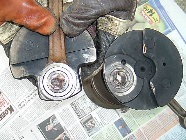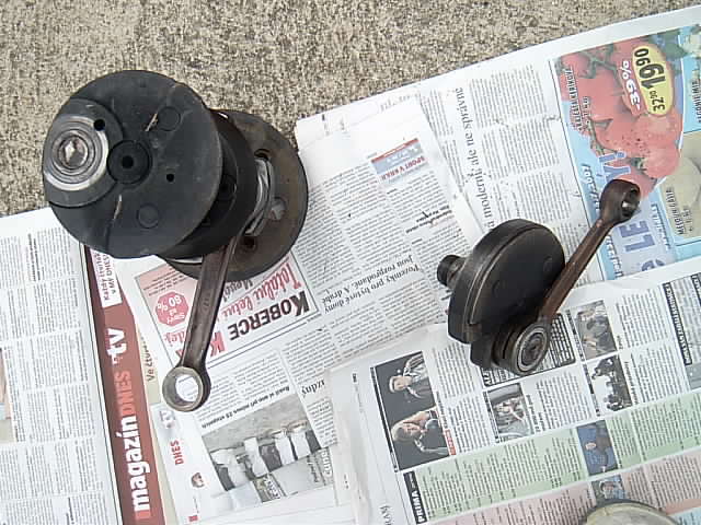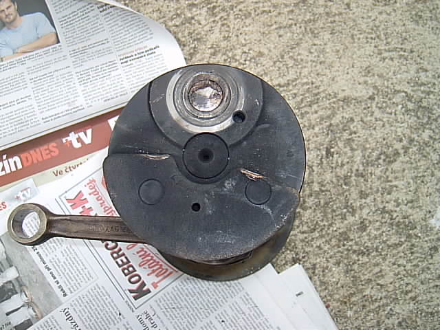 Motory Trabantů jsem opravoval od roku 1982 do asi roku 2003. V tom období jsem zjistil, že klikové hřídele Trabantů dávají na repasi jedni a ti samí lidé do těch stejných servisů, a že běžní majitelé Trabantů kterých je 95% klikovky vyhazují. Tím se originální klikové hřídele nerecyklují, ale končí v hutích, kdežto repase se dělají stále dokola ze stejných hřídelí. Takový klikovkový incest, který vede k degeneraci. Protože už také nejsou originální ojnice a jejich čepy, stávají se tyto repasované klikovky zdrojem problémů, proto jsem přestal generálkovat motory a i z ekonomického hlediska raději vadný motor měním za jiný, jetý, který je sice bez záruky, ale zato za cenu dvou pístů (obrazně,šťouralové!). Nyní se mi dostal do ruky motor, který dělal jiný mechanik a použil dobrou repasovanou hřídel, k jeho práci a poctivosti nemám výhrad, ale měl smůlu. Klikovka kterou majitel nebo mechanik sehnal jako repasovanou vydržela jen něco málo přes 2000km a maličko se poškodila. Čep jsme s přáteli odhadli jako příliš měkký. Protože došlo k odlomení posledního dílu u setrvačníku, tak setrvačník spadl v otáčkách (nebo se v ložisku vyklonil) až ke karteru a ozubení věnce zničilo karter tak, že by bylo velmi rizikové jeho další použití. Vyklopením se také opřel přítlačný kotouč spojky o hnací hřídel a asi prudkým nárazem praskla centrální přítlačná pružina, k poškození lamely nedošlo, protože již nebyla pevně spojena se setrvačníkem.